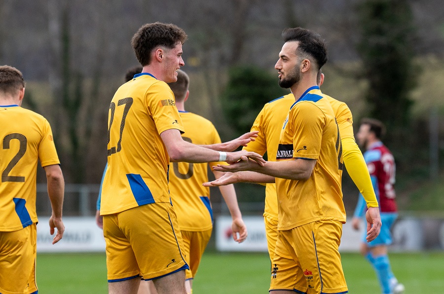 Marino Cavegn (l.) wird von Medin Murati zum Treffer beglückwünscht. Foto: Michael Zanghellini