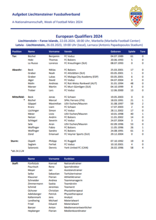 Für dieses Trainingslager und die zwei Spiele hat Nationaltrainer Konrad Fünfstück insgesamt 25 Spieler aufgeboten. Und der Nationaltrainer setzt seine Devise, auch auf junge Spieler zu setzen, fort. Denn im Kader stehen auch drei Spieler, die noch keinen Einsatz in der Nationalmannschaft absolviert haben, aber wie etwa Jonas Beck vom FC Schaan zumindest bereits einmal dabei waren. Dies gilt aber nicht für David Jäger und Emanuel Zünd, die das erste Mal überhaupt dem Kreis der Nationalmannschaft angehören. Diese können während des neuntägigen Zusammenzugs sicherlich von den erfahrenen Spielern wie Sandro Wolfinger, Benjamin Büchel, Maximilian Göppel, Dennis Salanovic, Marcel Büchel oder Aron Sele profitieren und einiges mitnehmen.