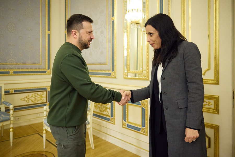 Präsident Volodymyr Zelensky begrüsst Aussenministerin Dominique Hasler in Kiew. IKR