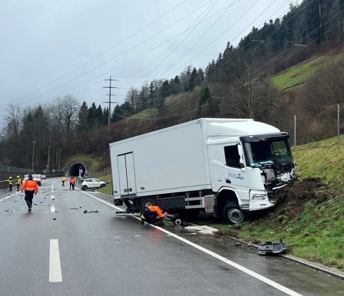 Wattwil – Am Dienstag (12.03.2024), um 14:10 Uhr, ist es auf der Umfahrungsstrasse H16 zu einer Frontalkollision zwischen einem Auto und einem Lastwagen gekommen. Eine 43-jährige Frau kam dabei ums Leben.