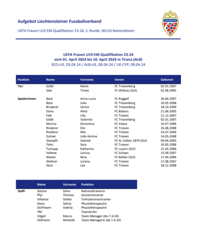 Fast gleichzeitig startet auch das Frauen U19-Nationalteam in das erste Spiel. Sie treffen um 11.30 Uhr in Tirana auf Schottland. Nach diesem Spiel stehen dann noch die Begegnungen mit Gastgeber Albanien und Zypern auf dem Programm, bevor sie nach zehn Tagen am 10. April wieder zurückkehren. «Wir werden sicherlich gefordert sein, dennoch ist die Freude bei Spielerinnen und Staff sehr gross, das erste Mal im neuen Jahr internationale Spiele bestreiten zu können», führt Frauen-Ressortleiterin Adrienne Krysl aus. Für diese drei Spiele hat Nationaltrainerin Silvia Steiner 19 Spielerinnen aufgeboten.