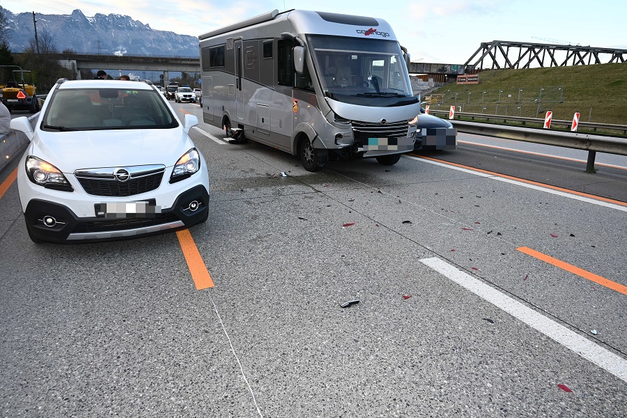 Ein 67-jähriger Mann fuhr mit seinem Camper auf der Normalspur im Baustellenbereich Richtung Sargans. Eine 29-jährige Autofahrerin befuhr die Beschleunigungsspur in der Autobahneinfahrt Buchs und beabsichtigte vor dem Camper auf die Autobahn Richtung Sargans einzufahren. Es kam zur Auffahrkollision zwischen den beiden Fahrzeugen. Das Auto der 29-Jährigen streifte daraufhin leicht das Auto einer 63-jährigen Autofahrerin, welches dabei leicht beschädigt wurde. Am Camper sowie am Auto der 29-jährigen Autofahrerin entstand Sachschaden von über 10’000 Franken. Die 29-Jährige verletzte sich bei dem Unfall leicht. Die Autobahn konnte für die Dauer der Unfallaufnahme nur einspurig befahren werden.