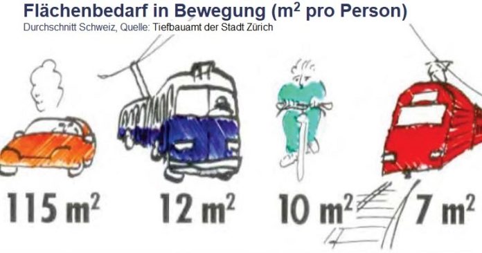 Aus wirtschaftlicher Sicht ist der Verkehr richtig organisiert, wenn Verkehrsmittel mit kleinem Flächenverbrauch bevorzugt werden. Viel Platz beansprucht die Wahl des Autos mit etwa 115 Quadratmeter pro Person in Bewegung; Autos erzeugen den Auto-Stau. Nur etwa 10 Quadratmeter beansprucht eine Person in Bewegung per Fahrrad oder mit dem öffentlichen Verkehr; zu Fuss sogar nur 3 Quadratmeter. Leute, die ihre Arbeitswege mit dem Auto zurücklegen sind laut Studien wegen Bewegungsmangel deutlich öfter krank als Leute mit aktiven Arbeitswegen; Autofahrende sind aus Sicht der Arbeitgeber nur schon wegen durchschnittlich mehr Absenztage deutlich weniger produktiv.