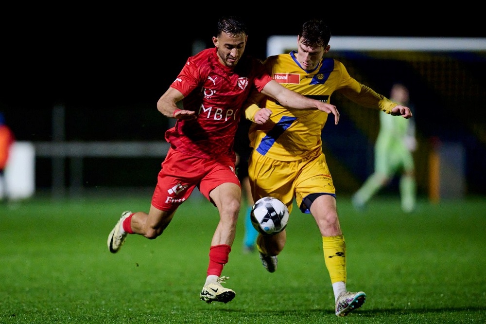 Sportanlage Rheinau Balzers, DI, 09.04.2024, Cup-Halbfinale zwischen FC Balzers I und FC Vaduz I, 0-5, im Bild Djokic (l.) gegen Cavegn. Foto: Michael Zanghellini