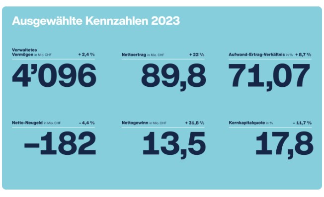Das verwaltete Kundenvermögen betrug per 31. Dezember 2023 CHF 4,1 Mia., was einem Wachstum von 2,39 % gegenüber der Vorperiode (2022: CHF 4,0 Mia.) entspricht.