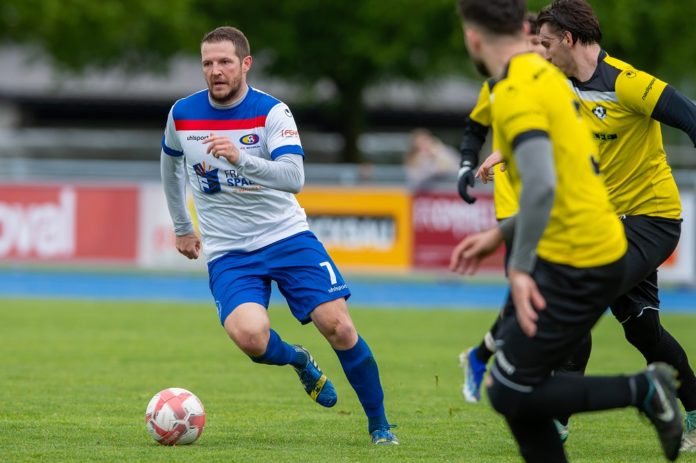 Der Schaaner Erfolgscoach und Spielertrainer Lucas Eberle (l.) im Zweikampf mit zwei Flumser. Foto: Jürgen Posch