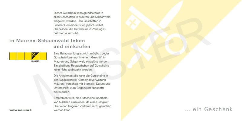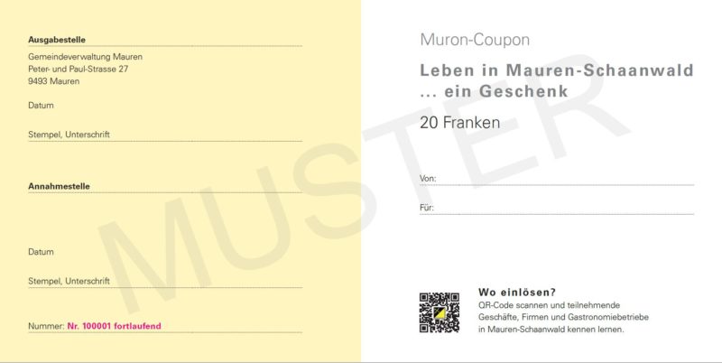 Auf Initiative der Gemeindevorstehung und Anregung der neu geschaffenen Kommission Wirtschaft werden nun sogenannte Muron-Coupons zu CHF 20 und CHF 50 lanciert. Die Muron-Coupons sind ab sofort beim Gemeindesekretariat erhältlich. Damit können neu auch alle Privatpersonen ihren Freunden und Verwandten ein wirklich besonderes, werthaltiges Geschenk bereiten. Einlösbar sind die Muron-Coupons ab sofort bei den allermeisten Geschäften in Mauren und Schaanwald, die vollständige Liste ist auf mauren.li abrufbar.