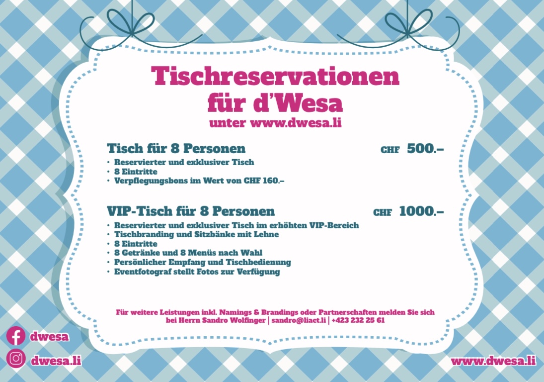 Ob mit der Familie oder Freunden, als Kundenanlass oder im Rahmen eines Mitarbeiterevents – ab sofort können unter www.dwesa.li Tische reserviert werden. Die Tischreservationen beinhalten neben acht Eintritten mit Verpflegung auch ein exklusives Recht auf den Tisch. Mit einem VIP-Tisch im erhöhten VIP-Bereich, persönlichem Empfang, Tischbranding, Sitzbänken mit Lehne, Verpflegung nach Wahl inklusive Tischbedienung sowie persönlichem Eventfotografen können Sie darüber hinaus für ein ganz besonderes Wesa-Erlebnis sorgen.
