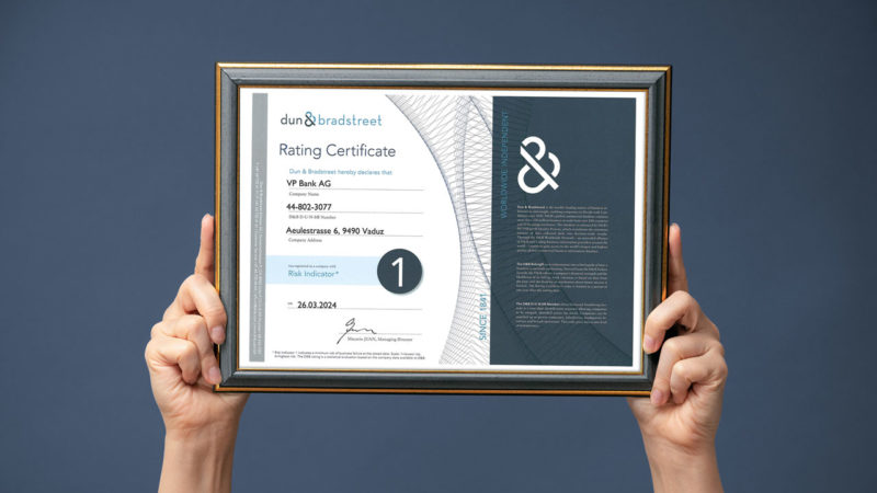 Dun & Bradstreet Worldwide hat die VP Bank Gruppe auch 2024 mit einem «Risk Indicator 1» für Risiko und Bonität ausgezeichnet. Dun & Bradstreet (Schweiz) AG überreichte der VP Bank das Rating Certificate bereits zum elften Mal in Folge.