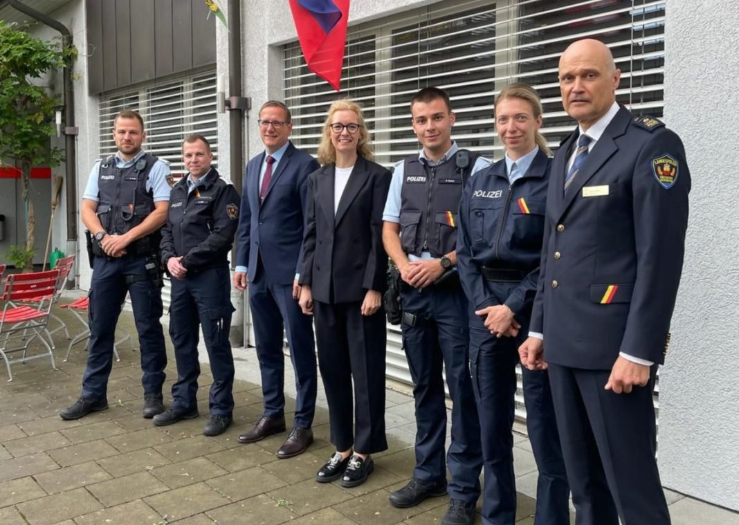 In Begleitung von Polizeichef Jules Hoch konnte sie einen Einblick in das Polizeieinsatztraining nehmen und sich mit den vier liechtensteinischen Polizeiaspiranten austauschen. Die Auszubildenden erhalten im Polizeieinsatztraining die Gelegenheit, die erlernten Fertigkeiten und theoretischen Kompetenzen zu vernetzen und in verschiedenen, polizeialltäglichen Situationen anzuwenden.
