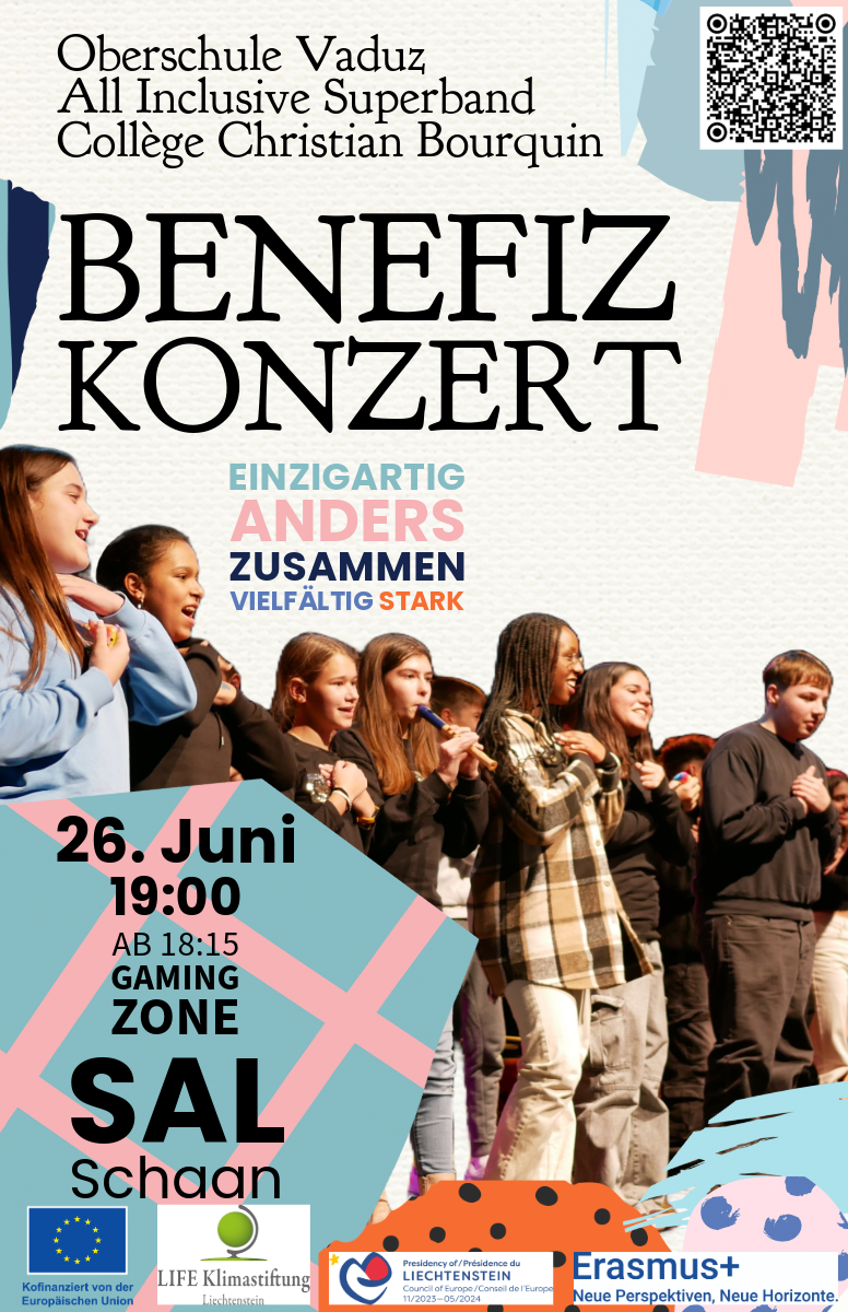 Mittwoch, 26. Juni. 19:00 SAL Schaan, Benefizkonzert zusammen der Oberschule Vaduz, ihrer Erasmus+ Partnerschule aus Frankreich und uns Superband.