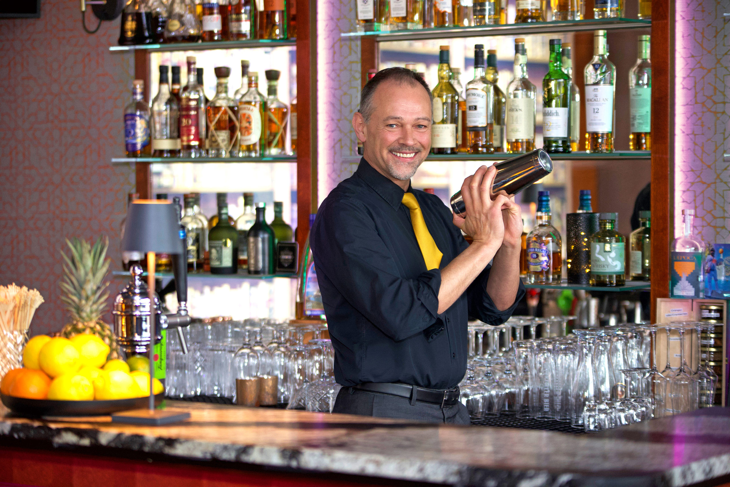 Die Rooftop Bar Floor Four im 4. Stock des Grand Casino ist im Stil eines englischen Gentleman`s Club eingerichtet und lässt mit seinem exklusiven Sortiment an Whisky-, Gin-, Rum und Zigarrensorten jedes «Geniesserherz» höherschlagen.