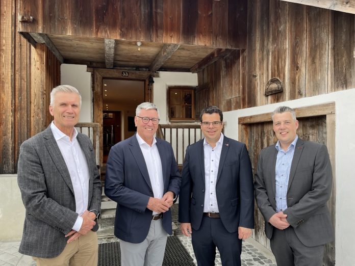 Foto, v.l.: Gabor Mödlagl (Leiter Bauamt Feldkirch), Wolfgang Matt (Bürgermeister Feldkirch), Christian Öhri (Gemeindevorsteher Ruggell) und Emanuel Matt (Leiter Bauverwaltung Ruggell).