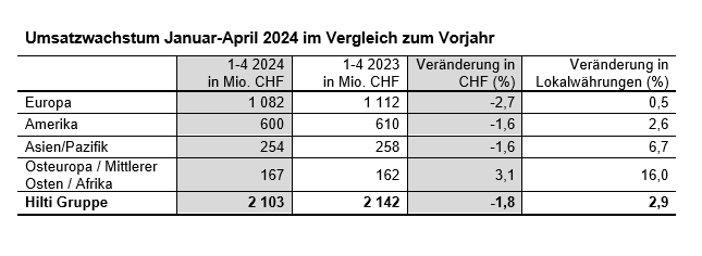 Die Hilti Gruppe erwirtschaftete in den ersten vier Monaten 2024 ein Wachstum von 2,9 Prozent in Lokalwährungen im Vergleich zum Vorjahreszeitraum. In Schweizer Franken sank der Umsatz aufgrund eines weiterhin deutlich negativen Währungseffekts um 1,8 Prozent auf CHF 2103 Mio.