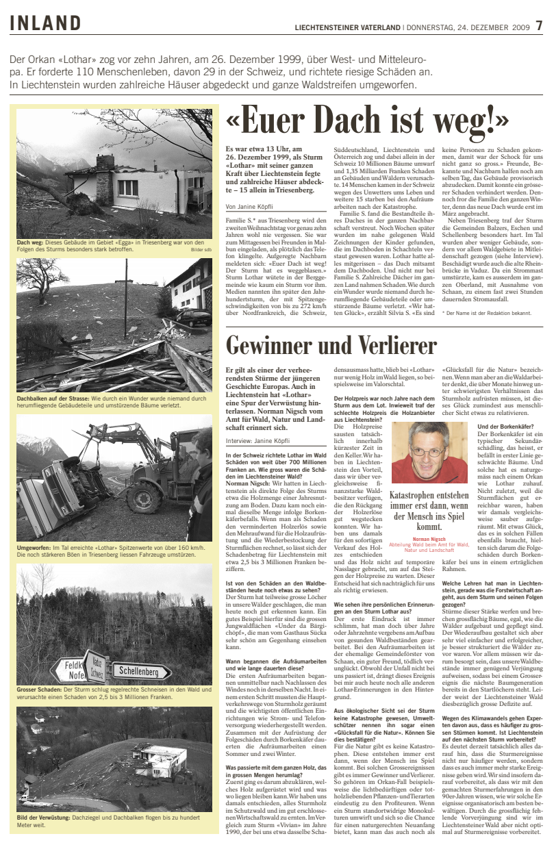 Aber nicht nur an der Infrastruktur, vor allem in den Wäldern habe «Lothar» grosse Schäden angerichtet, bilanzierte das «Liechtensteiner Vaterland» im Jahr 2019, also 20 Jahre nach dem Sturm: «Die Sturmböen fällten ganze Schneisen in die Wälder.» In Liechtenstein habe man 18’500 Kubikmeter Sturmholz errechnet – so viel wie in einem Jahr normalerweise anfalle. Die Waldschäden in Liechtenstein wurden mit 2,5 bis 3 Millionen Franken beziffert. Die grossen Mengen an Schadholz, die in ganz Europa anfielen, wirkten sich auch auf den Holzmarkt aus: Die Preise fielen, je nach Holzart, um 30 bis 80 Prozent, und erholten sich in den Folgejahren nur langsam. Die Förster in Liechtenstein hatten für längere Zeit zusätzliche Arbeit in den Wäldern: Nach dem Aufräumen musste mit dem Aufforsten begonnen werden. Heute sind die Narben, die «Lothar» in die Wälder geschlagen hat, kaum mehr sichtbar.