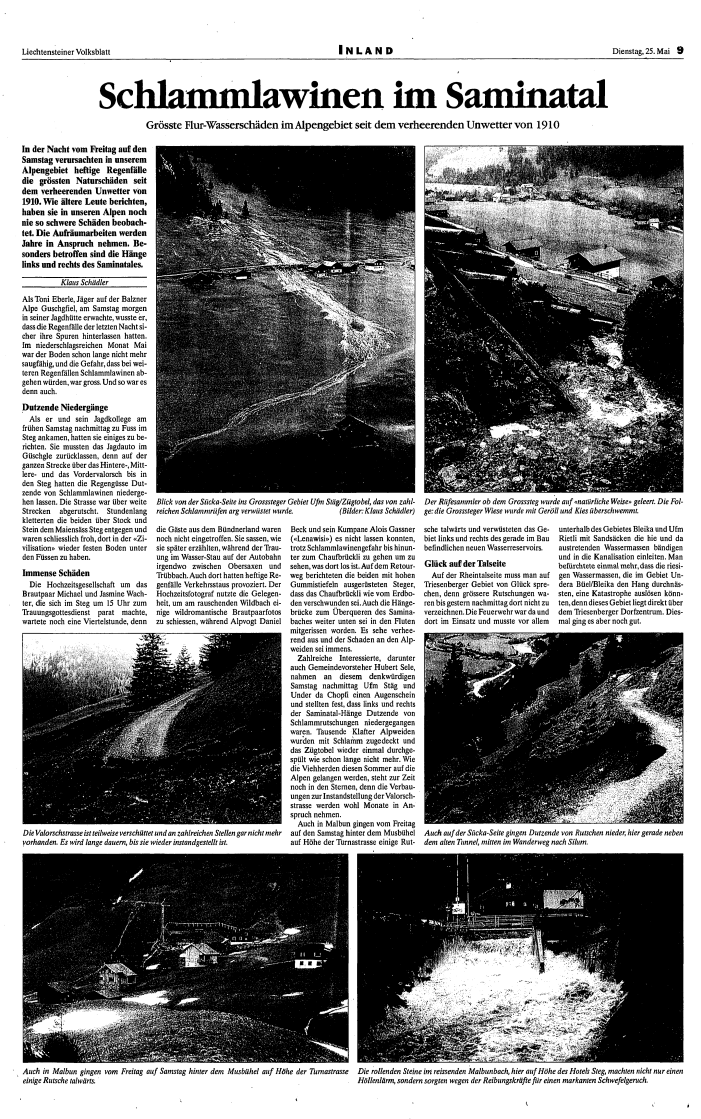 Bedrohlich sah die Wettersituation an verschiedenen Hanglagen aus. In Ruggell und Gamprin gerieten einige Hanggebiete ins Rutschen. Am Maurerberg gab es einen kleinen Bergsturz, sodass eine Gruppe Pfadfinder, die Pfingsten bei der Paula-Hütte verbringen wollte, evakuiert werden musste.