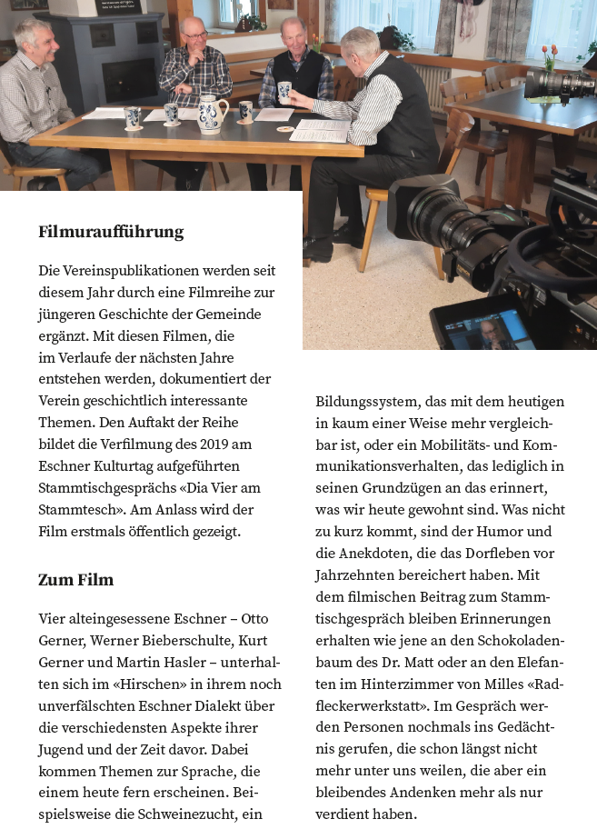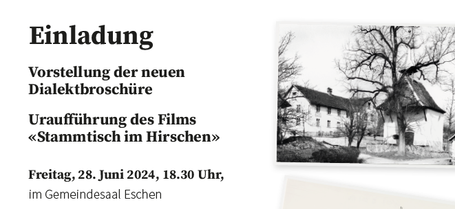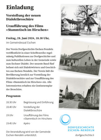 Der neueste Band fünf befasst sich mit Dialektwörtern und Geschichten aus Eschen-Nendeln. Wir laden euch herzlich zur Vorstellung der Dialektbroschüre und zur Uraufführung des Films «Stammtisch im Hirschen» ein.
