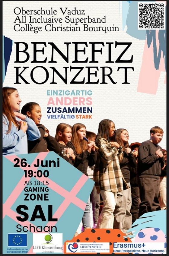 Wir, die Lehrpersonen und Schüler/innen der 2. Stufen der Oberschule Vaduz freuen uns, Sie zu einem ganz besonderen Konzertabend einzuladen! Am 26. Juni um 19:00 Uhr findet im SAL in Schaan ein Benefizkonzert statt, das unter dem Erasmusprojekt “Einzigartig anders – zusammen vielfältig stark” organisiert wird.