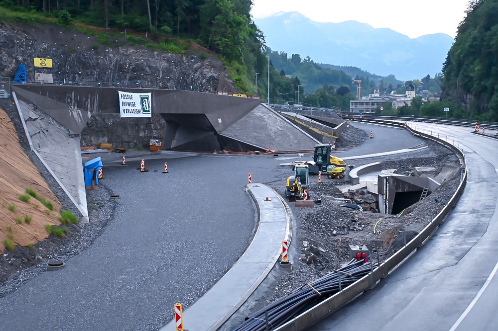 Feldkirch, 5. Juni 2024, 5:00 Uhr. In der Nacht auf Mittwoch haben Aktivist:innen von Extinction Rebellion ein Zeichen ihres Unmuts über die geplante Tunnelspinne auf der Baustelle Felsenau platziert.