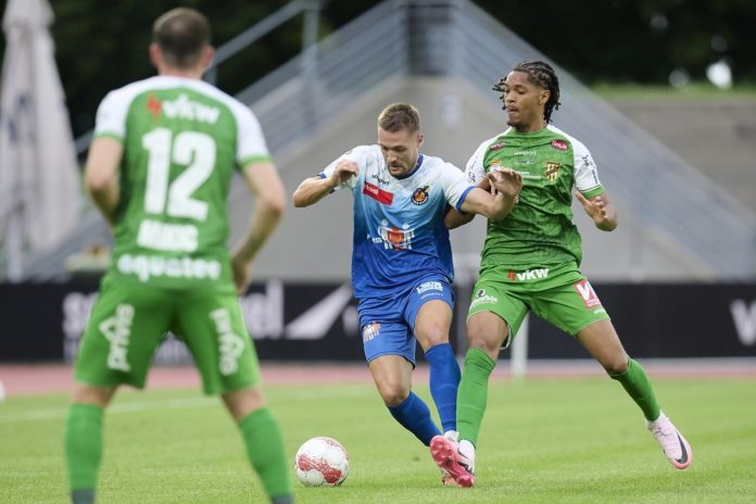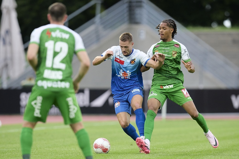 Szene vom Spiel gegen die Profis von Austria Lustenau am 02. Juli 2024. Verteidiger Lukas Graber (USV, Mitte) im Einsatz. (Foto: Michael Zanghellini)