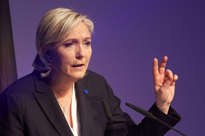 Die Präsidentin der Rassemblement National (FR), Marie Le Pen greift zur Machtübernahme in Frankreich. Le Pens Rassemblement National könnte von Macrons Neuwahlen stark profitieren. Foto: Picture Alliance, Frankfurt/Main