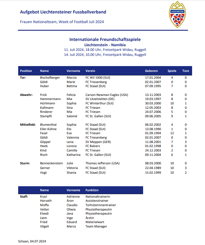 Da die nationalen Meisterschaften derzeit ruhen, stehen im Kader der Liechtensteinerinnen sehr zur Freude von Adrienne Krysl auch die im Ausland engagierten Spielerinnen. „Mit Ausnahme der rekonvaleszenten Spielerinnen sind praktisch alle an Bord und ich kann fast aus dem Vollen schöpfen“, so die Nationaltrainerin mit Vorfreude auf die beiden Spiele vom Donnerstag, 11. Juli (18 Uhr) und Sonntag, 14. Juli (10 Uhr) im Freizeitpark Widau in Ruggell.