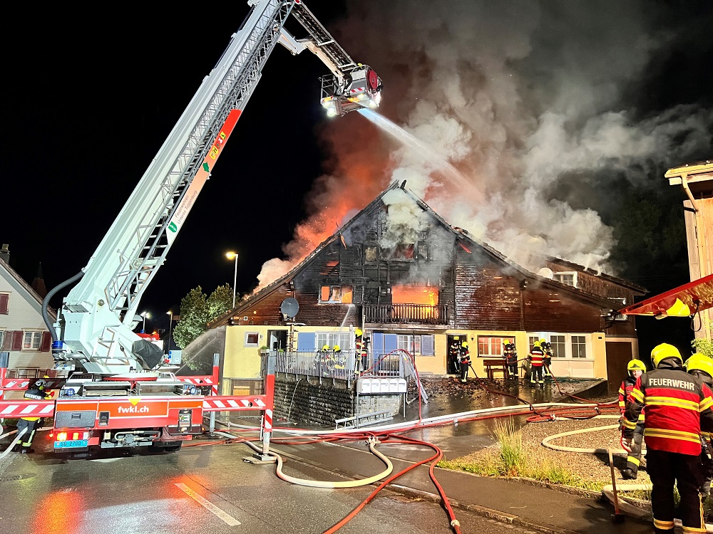 Anwohnende meldeten den Ausbruch eines Brands in einem Mehrfamilienhaus. Beim Eintreffen der Rettungskräfte stand die Liegenschaft bereits im Vollbrand. Zu Beginn des Einsatzes war unklar, wo sich die vier in der Liegenschaft gemeldeten Bewohnenden aufhalten. Drei Personen konnten bereits in einer frühen Phase des Einsatzes ausserhalb der Liegenschaft und unverletzt angetroffen werden. Ein vierter Bewohner wird vermisst.