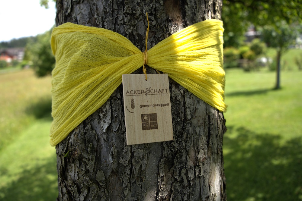 Das Konzept ist unkompliziert und mit wenig Aufwand verbunden: Wer Obstbäume oder Beerensträucher besitzt, die Früchte jedoch nicht vollständig abernten kann, bringt ein Gelbes Band als Markierung an. Dadurch wird signalisiert: Hier darf ohne Rücksprache und für den eigenen Bedarf gepflückt und aufgesammelt werden. Das Gelbe Band kann kostenlos bei der Gemeindeverwaltung Ruggell abgeholt werden. (Judith Augsburger, Gemeinde Ruggell und Elisabeth Müssner, Ackerschaft)