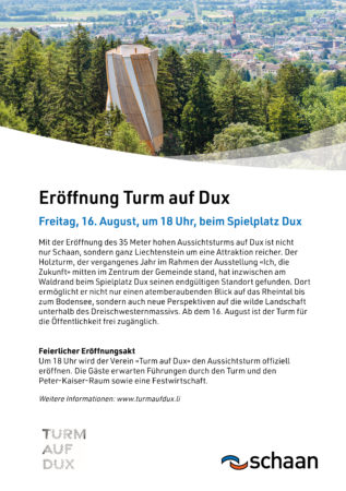 Am Freitag, 16. August: Eröffnung Turm auf Dux, Beginn 18 Uhr für Öffentlichkeit (im Vorfeld Eröffnungsfeier für geladene Gäste)