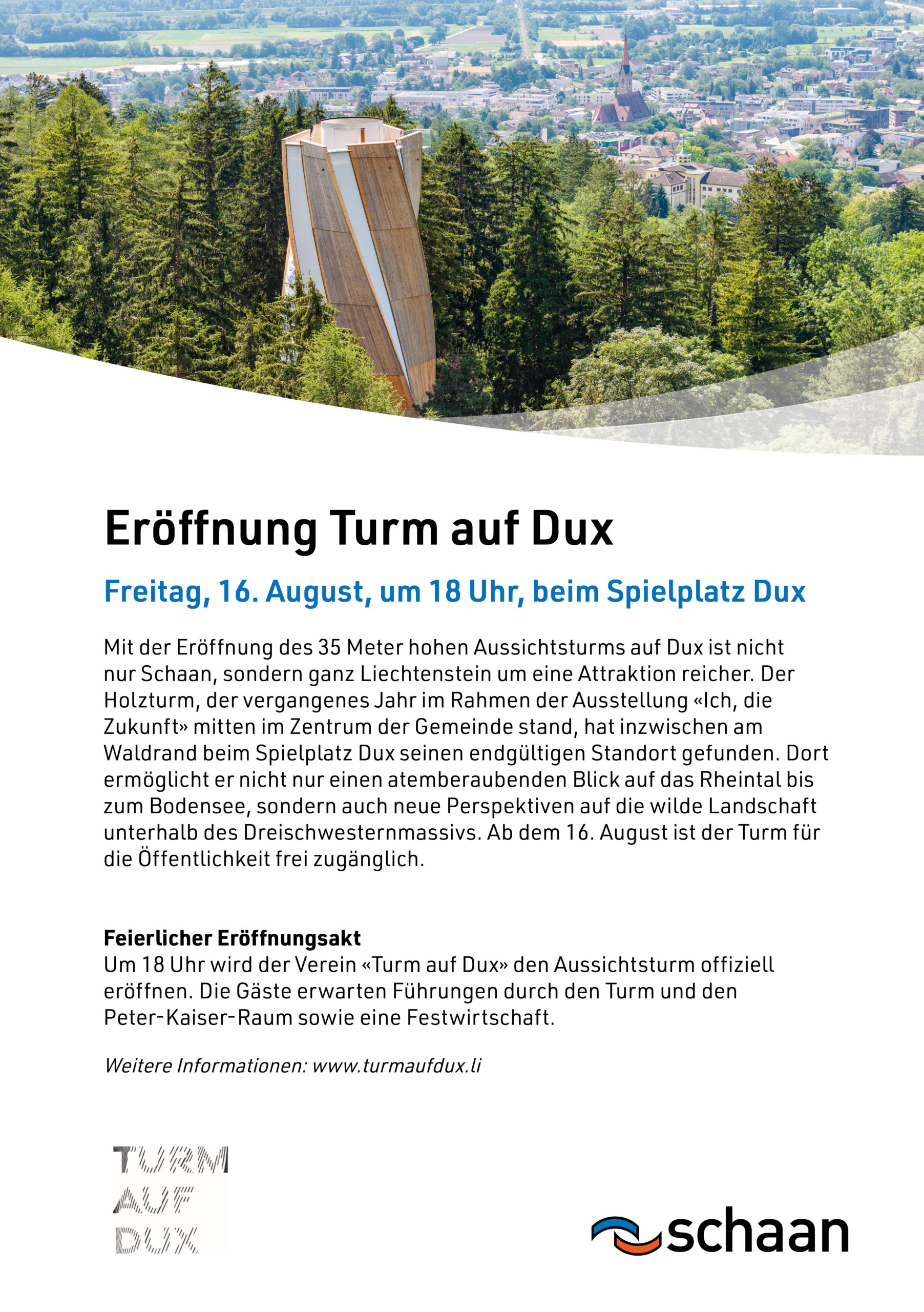 Am Freitag, 16. August: Eröffnung Turm auf Dux, Beginn 18 Uhr für Öffentlichkeit (im Vorfeld Eröffnungsfeier für geladene Gäste)