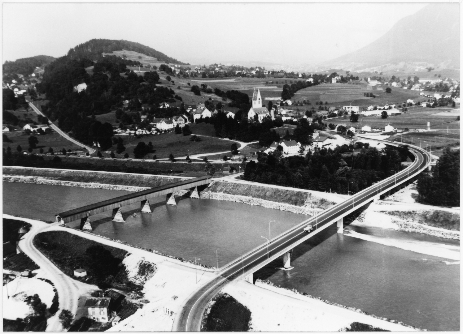 Es war nicht der erste Brand der Rheinbrücke Bendern – Haag. Die am 24. Mai 1868 eröffnete Brücke, die der liechtensteinische Landestechniker Peter Rheinberger geplant hatte, wurde 1894 ein Raub der Flammen. Schon zwei Jahre später stand eine neue Rheinbrücke, die eine Länge von 145 Metern aufwies und sich auf fünf Pfahljoche abstützte. Im Unterschied zur ersten Version, die noch kein Dach hatte, war die neue Brücke überdacht. Fast siebzig Jahre diente die Brücke dem Austausch der liechtensteinischen und schweizerischen Nachbarn. Als sie 1965 eine moderne Eisenbetonbrücke in unmittelbarer Nähe gebaut wurde, blieb die Holzkonstruktion bestehen, war aber für den motorisierten Verkehr gesperrt. Hingegen blieb sie als historisches Zeugnis für Fussgänger und Radfahrer noch etwa zehn Jahre bestehen – bis zuerst ein Brand die Zerstörung einleitete und dann der Zusammenbruch erfolgte.