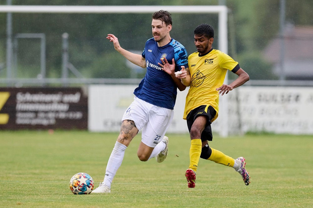 Hanselmann (FC Triesenberg, vorne am Ball) beim Spiel am 18.August zum Auftakt in Sevelen. Foto: Michael Zanghellini