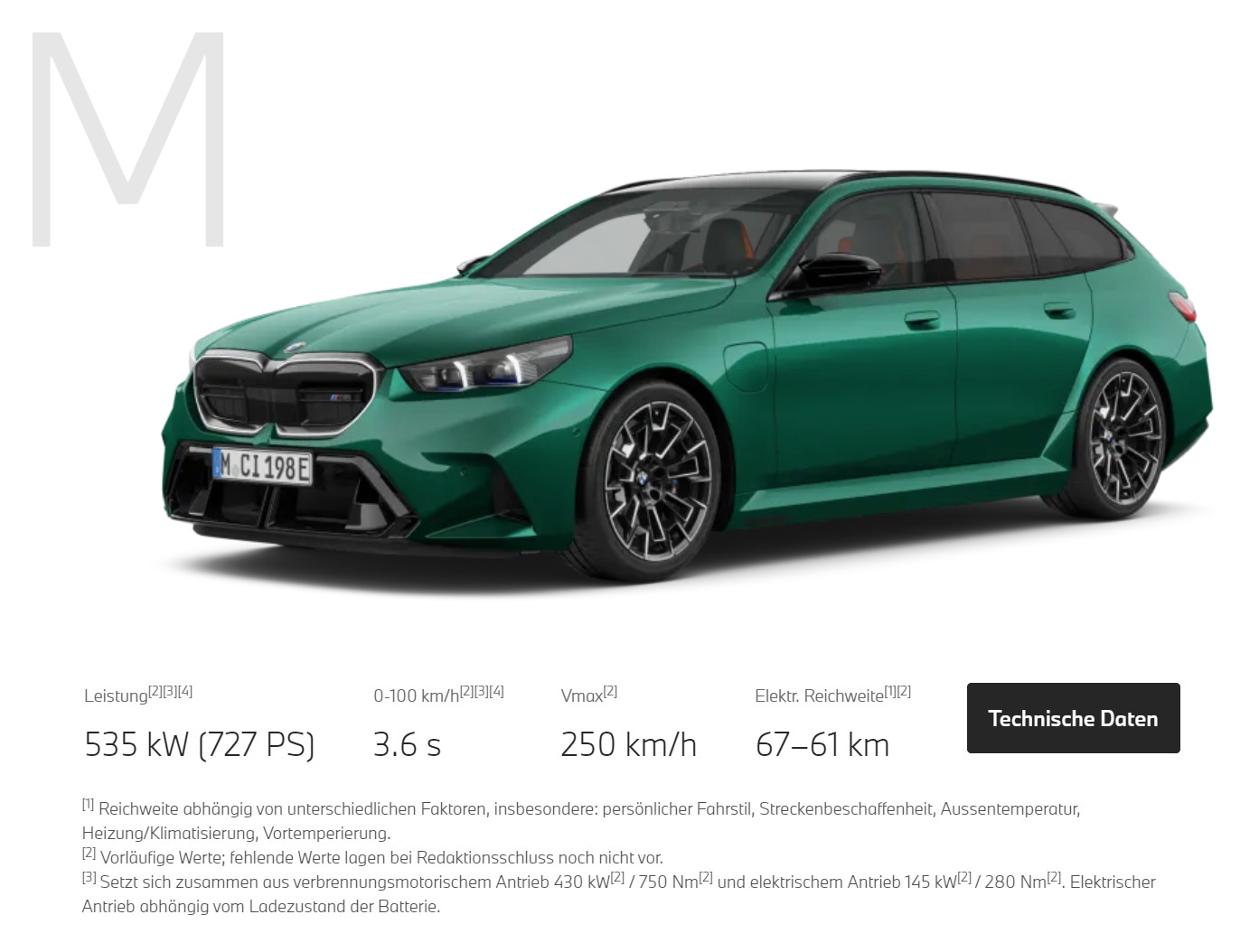 Der neue M5 Touring nutzt einen M-Hybrid-Antrieb, der auf dem BMW Hypercar basiert, das derzeit in der Langstrecken-WM aktiv ist. Dieser Antrieb kombiniert einen 4,4-Liter-V8-Motor mit bis zu 585 PS (430 kW) und einen Elektromotor mit 197 PS (145 kW). Zusammen ergibt das eine beeindruckende Systemleistung von 727 PS (535 kW) und ein Drehmoment von 1000 Nm, was den 2,5-Tonnen-Kombi in nur 3,6 Sekunden auf 100 km/h beschleunigt. Wer mit der elektronischen Begrenzung von 250 km/h nicht zufrieden ist, kann gegen Aufpreis eine Höchstgeschwindigkeit von bis zu 305 km/h wählen. Trotz seines Gewichtes bleibt der M5 Touring dynamisch und bietet dank eines adaptiven Fahrwerks und eines aktiven Differenzials eine präzise Kontrolle in Kurven. Der 5,09 Meter lange und 1,97 Meter breite Kombi ist zudem mit Kühlluftöffnungen an der Front für den Einsatz auf der Rennstrecke ausgestattet. Doch die meisten werden ihn wohl eher auf normalen Strassen nutzen, wo der Hybridantrieb ebenfalls Vorteile bietet.
