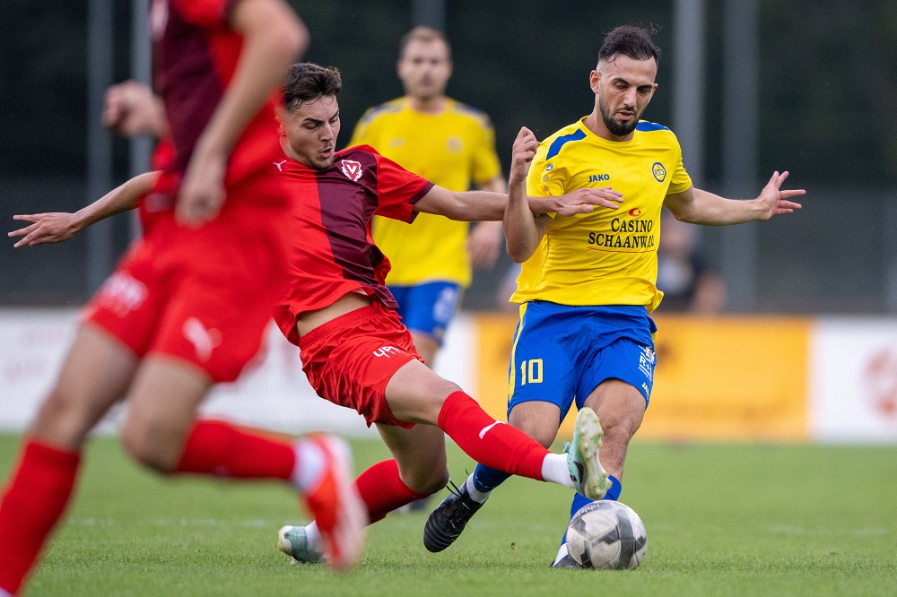 Balzers, 8.August 2024. Testspiel FC Balzers (2.Int.) gegen den FC Vaduz II (2). Im ganz rechts Murati (Nr.10) im Zweikampf mit Luque (FCV). Foto: Jürgen Posch