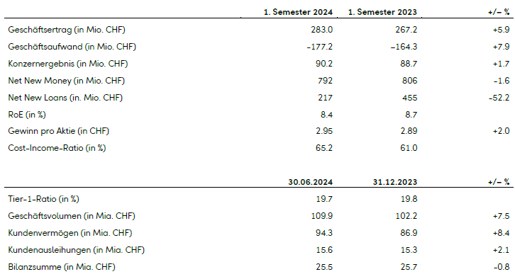 Der Geschäftsertrag nahm im ersten Semester 2024 um 5.9 Prozent auf CHF 283.0 Mio. zu (1. Semester 2023: CHF 267.2 Mio.). Darin zeigt sich die Stärke des diversifizierten Geschäftsmodells der Bankengruppe.