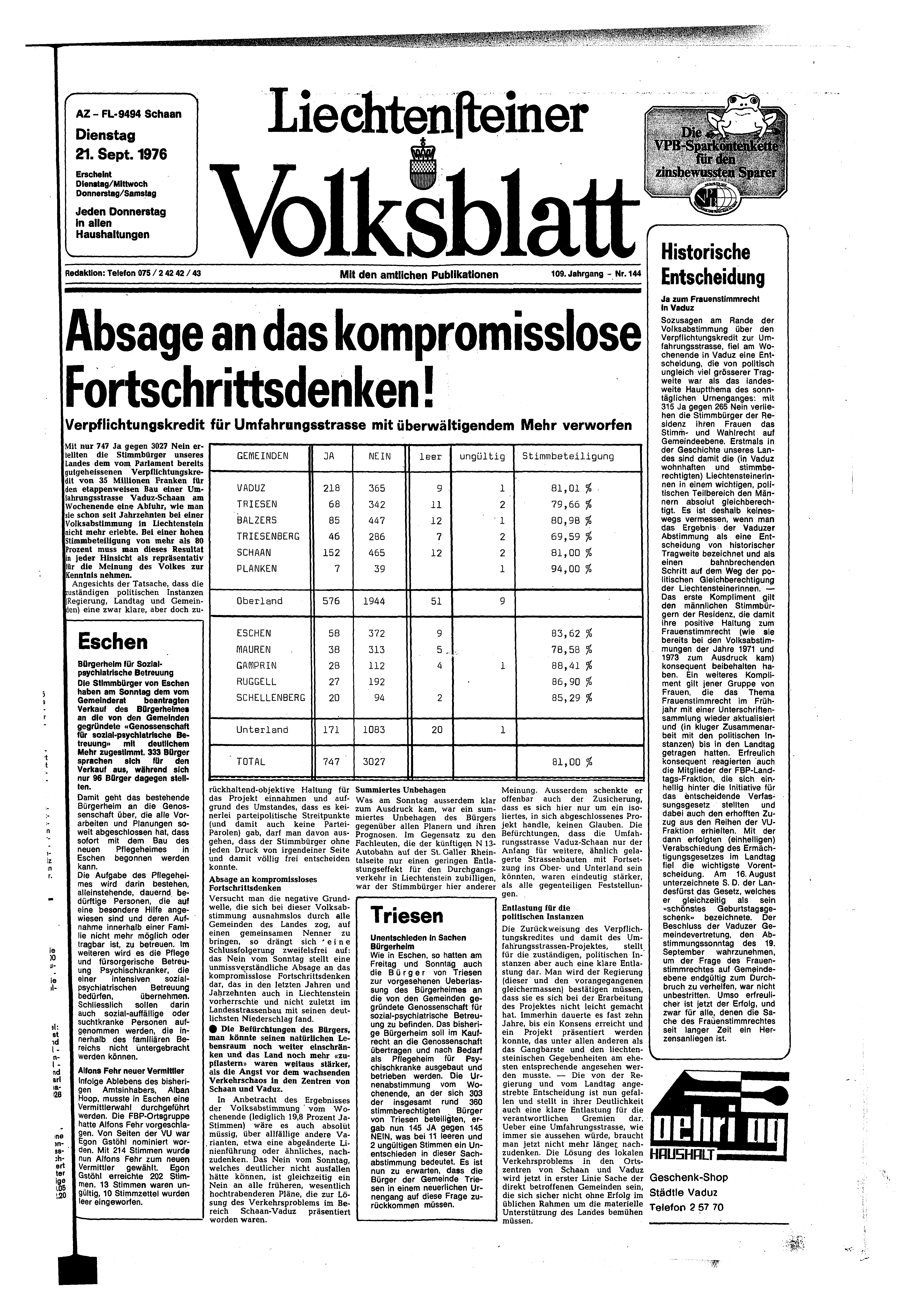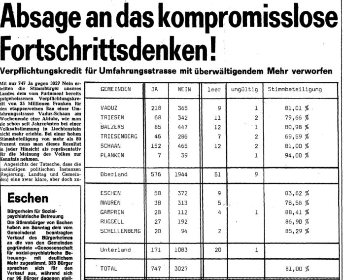 Regierung, Landtag und LGU blieben bei der Abstimmung am 19. September 1976 mit ihrer Zustimmung zur Umfahrung von Vaduz und Schaan weitgehend allein. Bei einer Stimmbeteiligung von 81 Prozent sprachen sich nur 747 Stimmberechtigte für das Projekt aus, während 3027 dagegen stimmten. In keiner einzigen Gemeinde gab es eine Mehrheit, auch in Vaduz und Schaan überwogen die Nein-Stimmen deutlich: In Vaduz gab es 218 Ja und 365 Nein, in Schaan votierten nur 152 dafür, 465 dagegen. Das «Volksblatt» setzte nach der Ablehnung der Umfahrungsstrasse den Titel «Absage an das kompromisslose Fortschrittsdenken!»