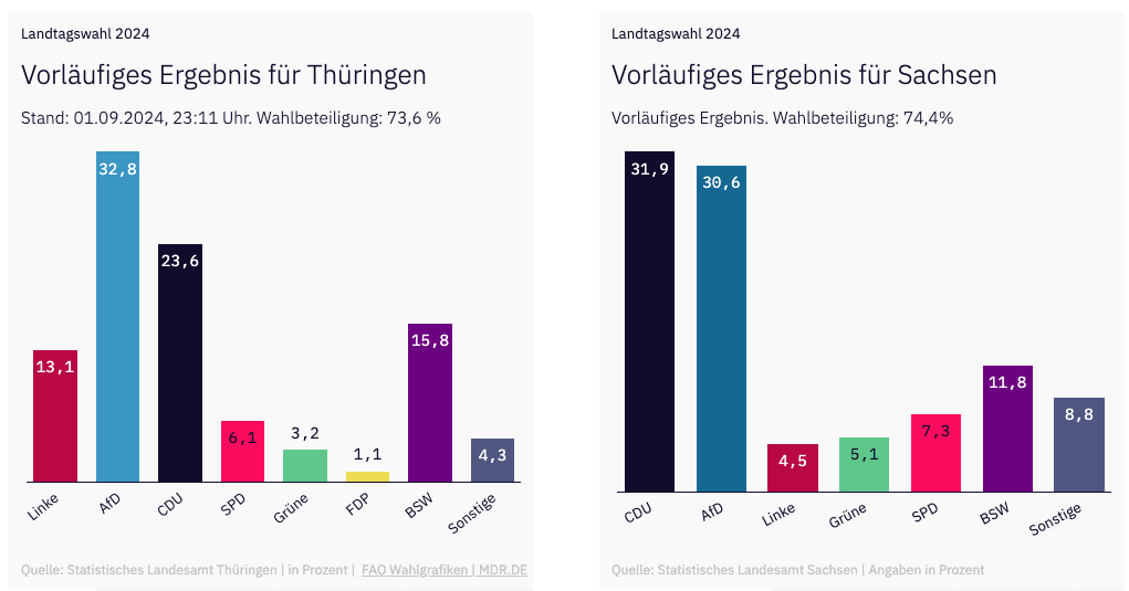 Diese hohe Wahlbeteiligung zeigt, dass das politische Interesse der Bevölkerung in beiden Ländern offenbar stark gestiegen ist. Doch diese Mobilisierung hat auch zu einer deutlichen Verschiebung der Machtverhältnisse geführt. Besonders die AfD konnte davon profitieren und in Thüringen mit 32,8 % der Stimmen erstmals die stärkste Kraft werden. Auch in Sachsen erzielte die Partei mit 30,6 % ein historisch starkes Ergebnis, lag aber hinter der CDU.