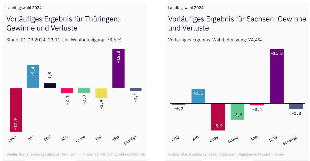 Auf der anderen Seite der politischen Skala erlitten die etablierten Parteien teils dramatische Verluste. Besonders die SPD musste schwere Einbussen hinnehmen. Mit 6,1 % in Thüringen und 7,3 % in Sachsen erzielte sie ihre historisch schlechtesten Ergebnisse bei Landtagswahlen. Auch die Linke, die in Thüringen einst eine dominierende Rolle spielte, verlor massiv an Boden und büsste ganze 18 Prozentpunkte ein. Dies stellt einen schweren Rückschlag für die Partei dar, die in den vergangenen Jahren deutlich stärker aufgestellt war.