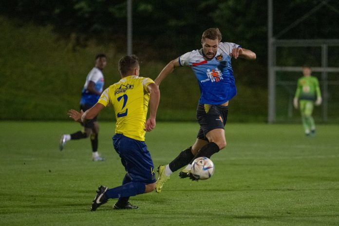 FL Cup: Erstligist USV gewinnt gegen Triesenberg 0:4. Im Bild Abwehrspieler Graber (USV) wird vom Triesenberger Beck (3) angegriffen.