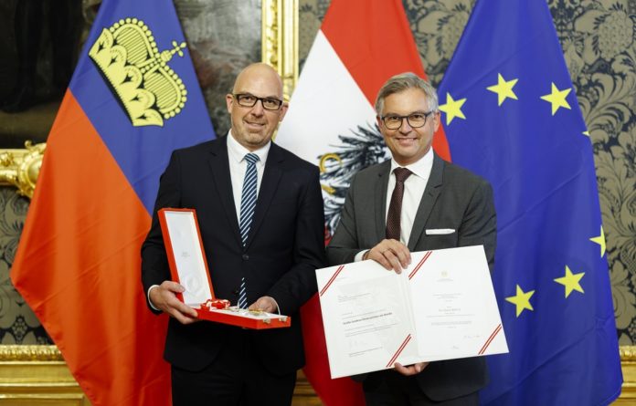 Für seine geschätzten und steten Verdienste um die Beziehungen zwischen Österreich und Liechtenstein verlieh Bundesminister Magnus Brunner im Namen des Bundespräsidenten Alexander Van der Bellen dem Liechtensteinischen Regierungschef das grosse Goldene Ehrenzeichen am Bande für Verdienste um die Republik Österreich.