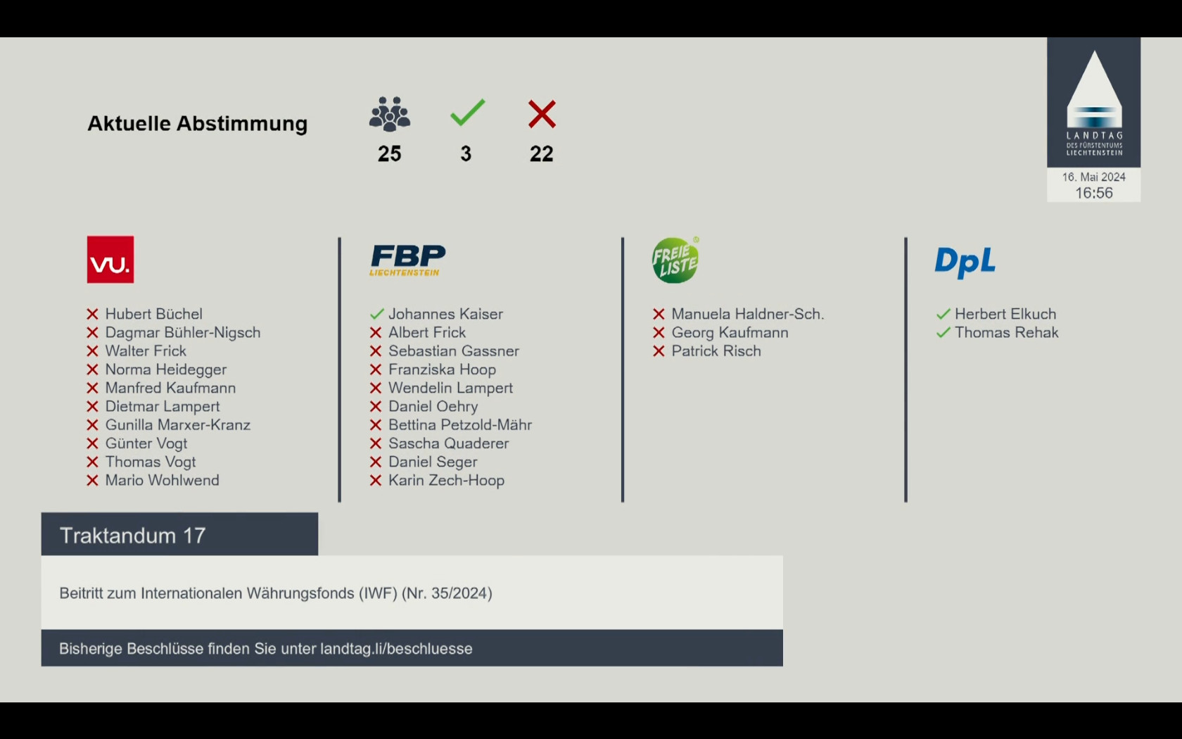 Zweitens: 19 der Landtagsabgeordneten hatten am 16. Mai die Zustimmung bezüglich IWF-Beitritt erteilt – 6 hatten sich gegen eine IWF-Mitgliedschaft ausgesprochen. In Prozenten heisst dies: 76 Prozent unserer Abgeordneten waren für den IWF gewesen, 24 Prozent dagegen. Man vergleiche die Verhältnisse hinsichtlich Prozentzahlen: 76 Prozent zu 24 Prozent (Landtag); 56 Prozent zu 44 Prozent (Stimmvolk).
