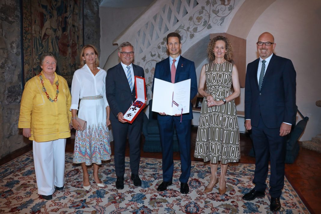 Erbprinz Alois von und zu Liechtenstein hat in Stellvertretung von Fürst Hans-Adam II. am Montag, 2. September 2024, Magnus Brunner, Bundesminister für Finanzen der Republik Österreich, zur Ordensverleihung auf Schloss Vaduz empfangen.