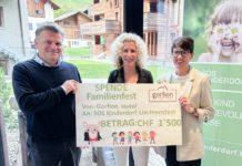Voller Freude durfte Maike Hilti vom SOS-Kinderdorf Liechtenstein einen Spendencheck in Höhe von 1500 CHF von Petra Sternat und Alexander Berger vom Gorfion Familotel...