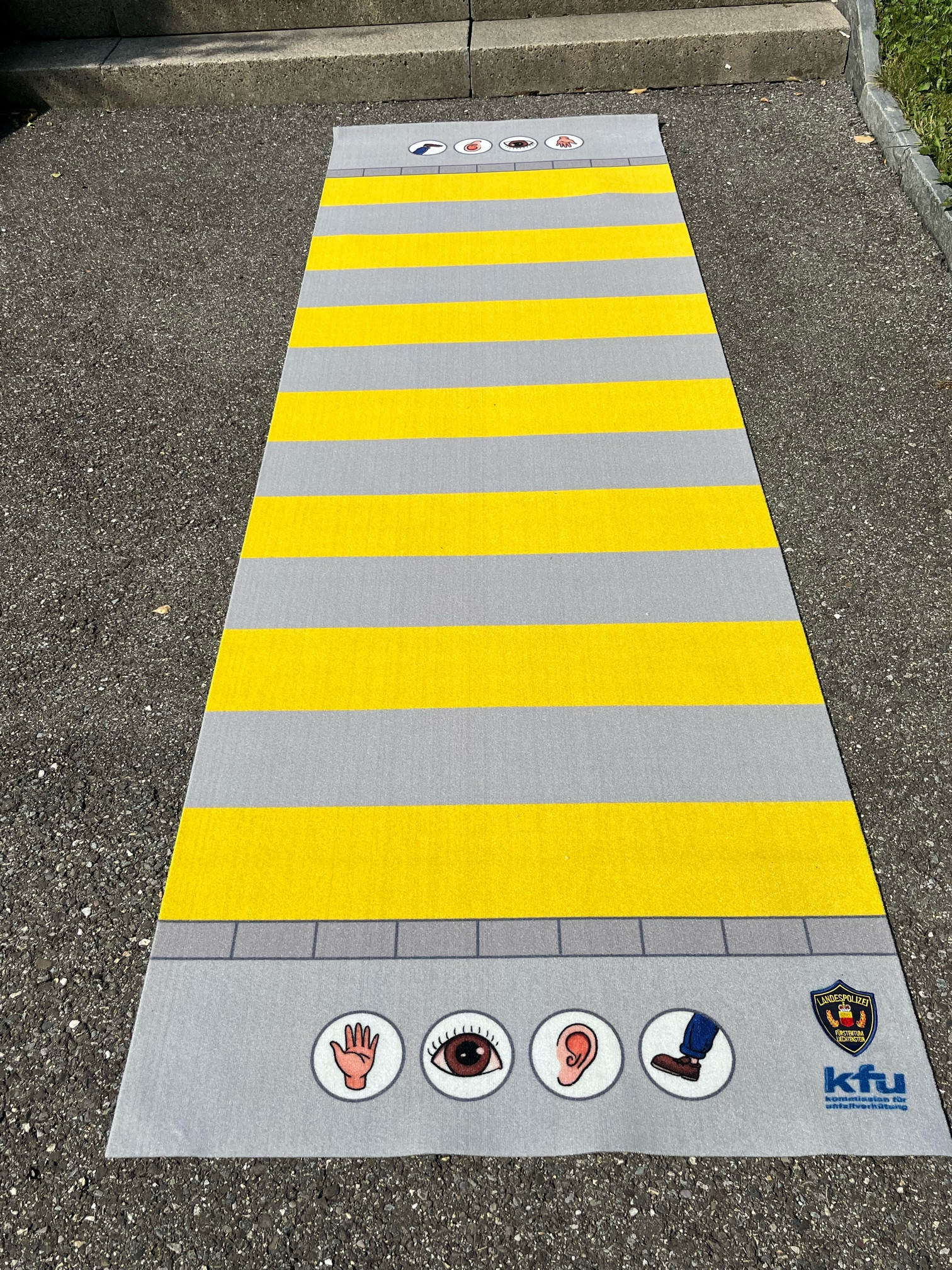 Nun ist als neues Lehrmittel der Verkehrsteppich „Fussgängerstreifen“ hinzugekommen, mit dem das richtige Verhalten im Strassenverkehr spielerisch geübt werden kann.