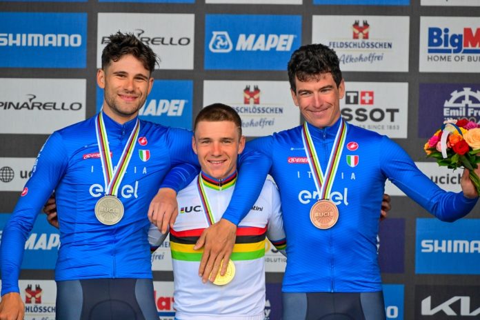 Siegerehrung Remco EVENEPOEL (Belgien, BEL) gewinnt vor Filippo GANNA, u. Edoardo AFFINI (Italien, Italy, ITA) das Elite-Einzelzeitfahrens der Männer bei den UCI-Straßen- und Para-Cycling-Straßenweltmeisterschaften 2024 am Sonntag, den 22. September 2024, in Zürich, Schweiz. Die Radsport WM findet vom 21. bis 29. September 2024 um und in Zürich im Rahmen der 2024 UCI Road and Para-cycling Road World Championships statt. Foto: Picture Alliance, Frankfurt/Main