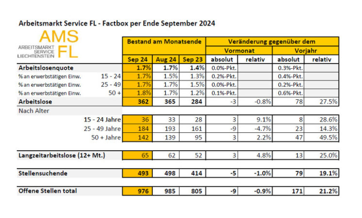 Beim Arbeitsmarkt Service Liechtenstein (AMS FL) waren Ende September 362 Personen arbeitslos gemeldet.