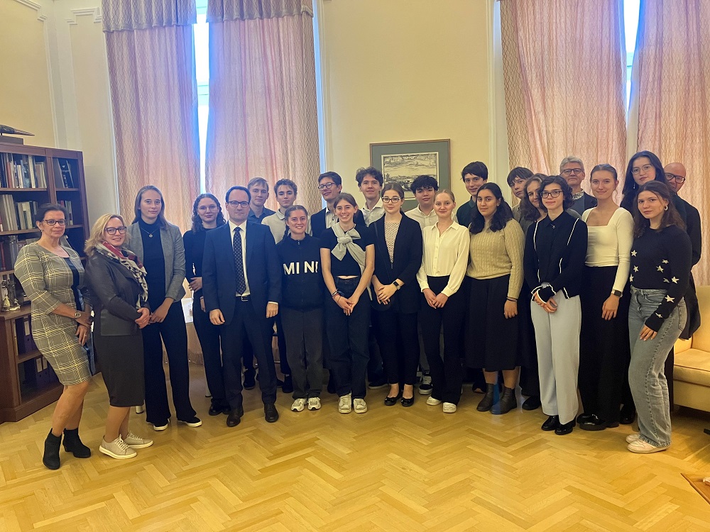 Von 29. September bis 4. Oktober reiste eine Schülergruppe des Liechtensteinischen Gymnasiums in Vaduz über Wien nach Brünn. Am 30. September besuchte die Gruppe gemeinsam mit den Schülerinnen und Schülern des Matyás-Lerch Gymnasiums aus Brünn die Liechtensteinische Botschaft in Wien.
