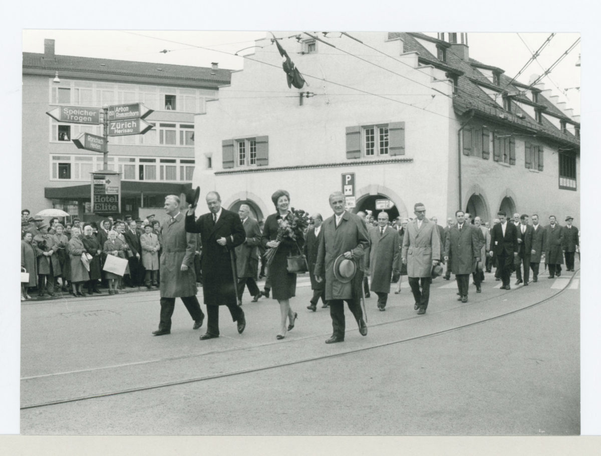 Im Rahmen der OLMA 1964 wurde ein spezieller Liechtenstein-Tag organisiert. Um möglichst viele Besucherinnen und Besucher aus Liechtenstein und dem Rheintal nach St. Gallen zu bringen, stellte die SBB einige Sonderzüge zur Verfügung. Petrus war dem Liechtenstein-Tag allerdings nicht wohlgesonnen, denn immer wieder regnete es – nur beim festlichen Umzug durch die Stadt gab es kurze trockene Phasen. Die St. Galler kamen in Scharen, säumten die Strassen der Innenstadt und applaudierten den einzelnen Umzugsgruppen. Im Mittelpunkt des Interesses standen natürlich Fürst Franz Josef II. und Fürstin Gina, denn ein adeliges Herrscherpaar bekamen die republikanischen Eidgenossen nicht oft zu bestaunen. Etwas im royalen Schatten standen die Mitglieder der Regierung und des Landtags, aber auch die Schweizer Landes- und Kantonspolitiker.