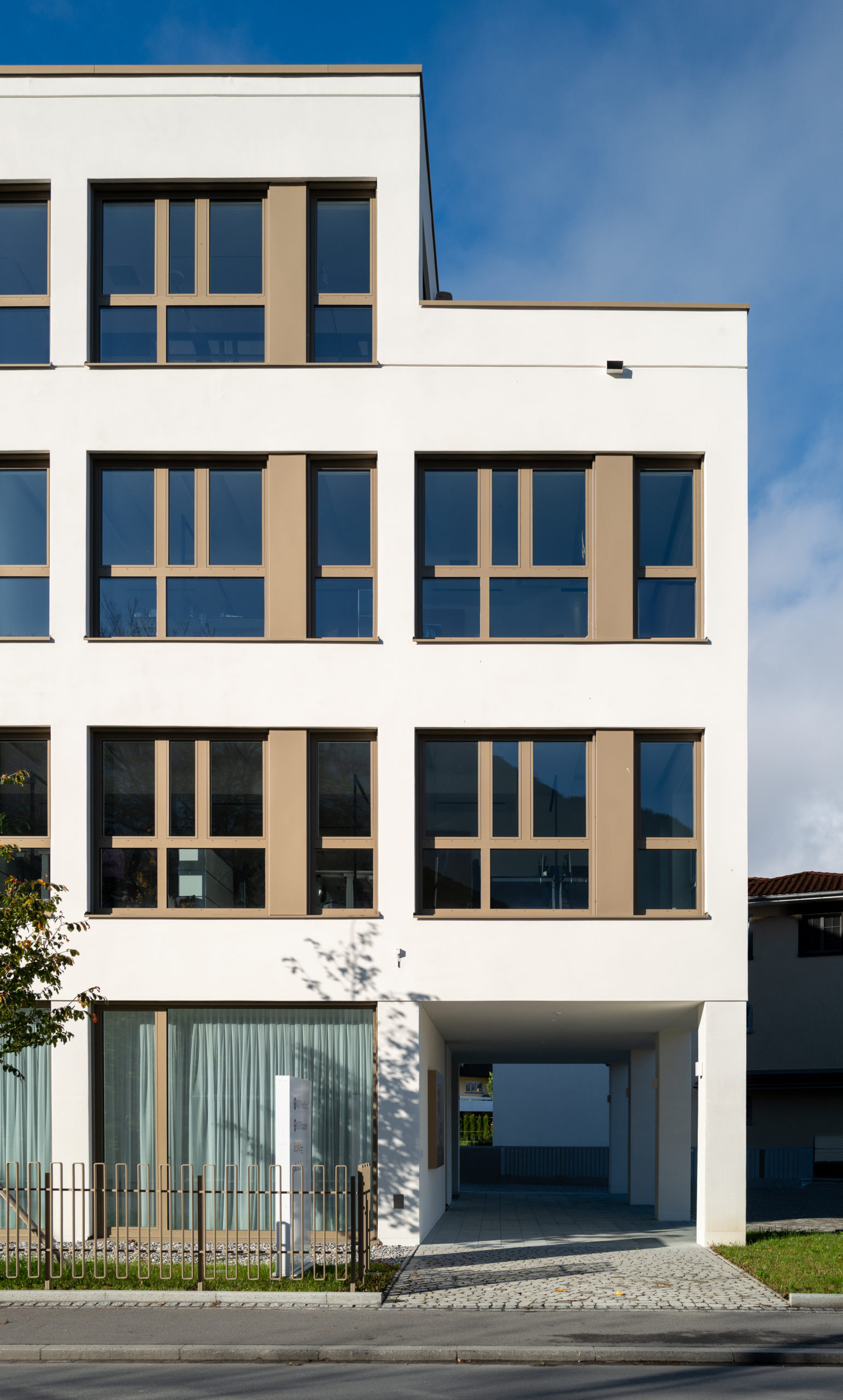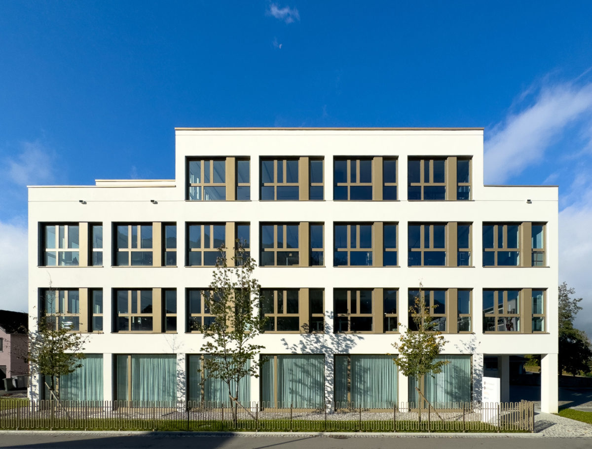 Das neue Bürohaus Bretscha liegt in der Gewerbezone 1, in unmittelbarer Nachbarschaft zur Gewerbezone 2, dem Schaaner «Industriegebiet» Im alten Riet, mit seinen grossvolumigen dominanten Bauten. «Auf diese Nachbarschaft vermag das neue Bürohaus zu reagieren. Die klare, starke Volumetrie des Bürohauses Bretscha steht selbstbewusst an der Strasse. Sie wird mit einer feingliedrigen Fassadengestaltung gezeichnet. Das erhöhte Erdgeschoss wirkt leicht, und erhält mit einem feinen Kammputz einen Sockelcharakter», sagt Ralf Jehle. Auf dem Erdgeschoss stehen zwei Vollgeschosse und ein Attikageschoss. Die gleichförmigen Fensterformate verbinden diese drei Stockwerke gestalterisch. Durch die Repetition der feingegliederten Fensterformate entsteht eine elegante klare Fassadensprache. «Unser Ziel war es, ein Gebäude zu planen, das zeigt, wie die Bauten entlang der Strasse Im Bretscha sich künftig zum Strassenraum hin ausrichten sollen, sich dadurch mit der Umgebung und dem öffentlichen Raum verbinden und diesen so aufzuwerten vermögen.»