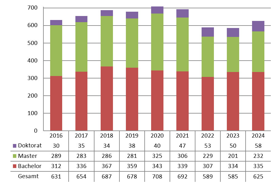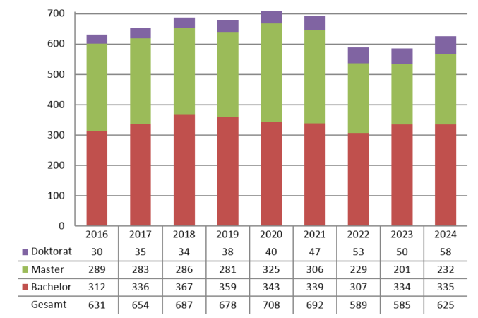 Zum Stichtag am 15. November 2024 sind 625 Studierende in den konsekutiven Programmen eingeschrieben. Dies bedeutet eine erfreuliche Steigerung gegenüber den 585 Studierenden im Vorjahr.
